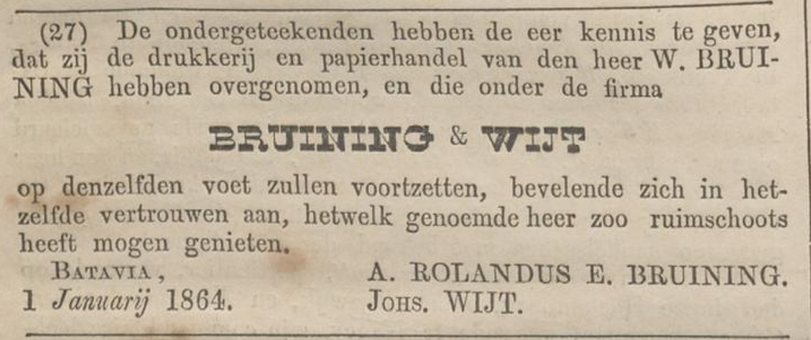 Sumber: Javasche Courant, 9 Januari 1864, 5 Desember 1864, 4 Januari 1867, 26 Mei 1868; Bataviaasch Handelsblad, 27 Januari 1864, 29 Oktober 1864, 11 Desember 1865, 30 Desember 1865, 3 Januari 1866, 28 Februari 1885; Java-bode, 11 Mei 1864; De Locomotief, 28 Agustus 1865, 23 Juli 1866; Nieuwsblad voor den Boekhandel, jrg. 45, no. 98, 10 Desember 1878; Het Nieuws van den Dag voor Nederlandsch-Indië, 28 Agustus 1913; Genealogieonline.nl, entri Johannes Wijt; Geneanet.org, entri Abraham Rolandus Elbertus Bruining.