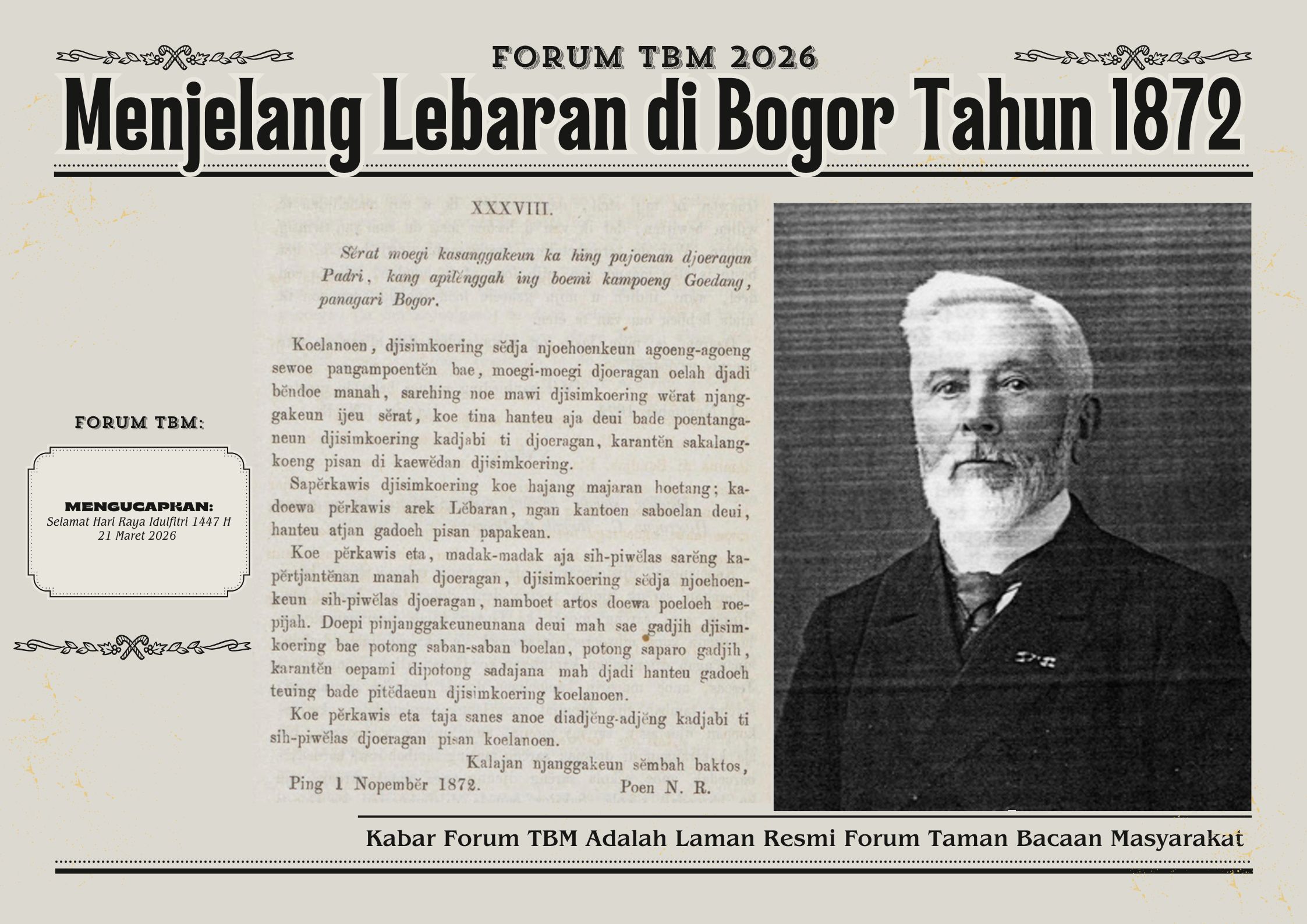 Pada 1 November 1872, penulis N.R. melayangkan surat singkat berbahasa Sunda halus kepada “djoeragan Padri” (tuan pendeta) atau “heer leeraar” (tuan guru). Alamat yang dituju si penulis selengkapnya adalah “Serat moegi kasanggakeun ka hing pajoenan djoeragan Padri, kang apilenggah ing boemi kampoeng Goedang, panagari Bogor” (Surat yang kiranya dapat disampaikan kepada Tuan Padri, yang bertempat tinggal di rumahnya di Kampung Goedang, Kota Bogor).