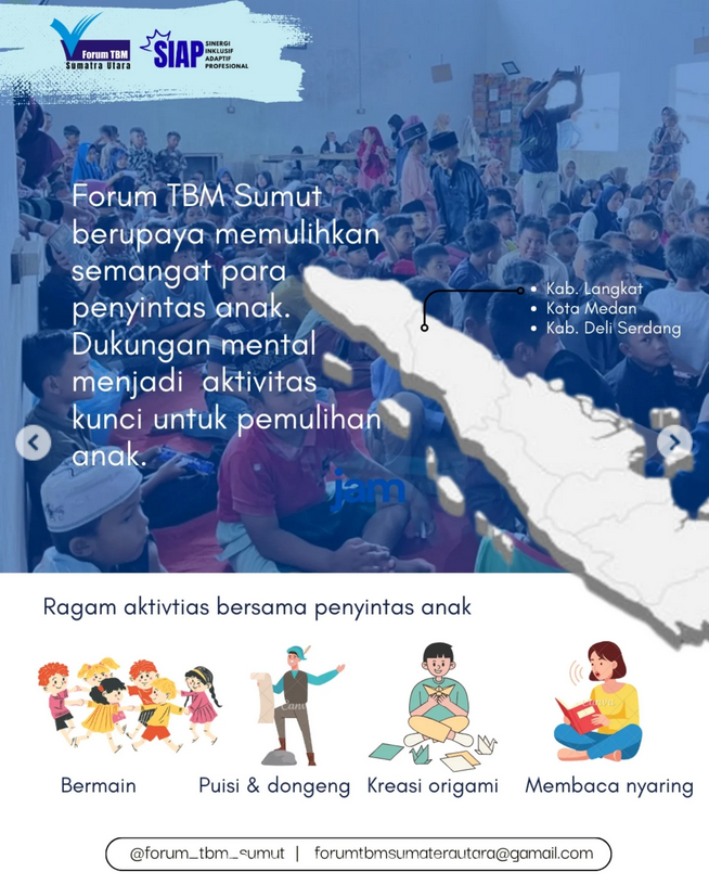 Forum TBM (Taman Bacaan Masyarakat) Sumatera Utara hadir dalam agenda psikososial, yakni penyembuhan trauma di tengah warga. Sofyanto, Ketua Forum TBM Sumut menceritakan program psikososial bagi warga terdampak bencana besar di Sumatera Utara. Program itu terselenggara pada Minggu, 21 Desember 2025 lalu. Organisasi yang dimpinnya bergerak menghimpun donasi lalu disalurkan ke masjid, musala, Madrasah Diniyah Awaliyah (MDA) Al Washliyah, dan juga ke TBM terdampak.