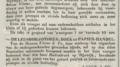 Sejak pertengahan 1845, Ukena & Co menunjukkan kebangkrutan. Pada 24 Juli 1845, di rumah Ukena & Co., di Noordwijk, dilelang surat berharga dan barang-barang lain. Kemudian pada 30 Agustus 1845 diumumkan toko buku, perpustakaan baca, serta perdagangan buku dan kertas milik Ukena & Co telah dijual dan diambil alih oleh Firma Lange & Co. Lange & Co akan membuka lagi usaha tersebut di lokasi baru di Rijswijk. Selain itu, disebutkan bangunan yang sebelumnya ditempati “boekhandelaar Ukena” telah digunakan oleh pedagang lain, Mw. Davelaar.