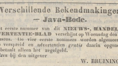 Foto 02. W. Bruining mengumukan sudah menerbitkan surat kabar Java-bode. Sumber: Javasche Courant, 07-08-1852.