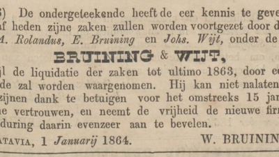 Meski demikian, sebelumnya, pada 1 Januari 1864, usaha W. Bruining menyerahkan usahanya untuk dilanjutkan oleh A. Rolandus E. Bruining dan Johs. Wijt, di bawah nama perusahaan Bruining & Wijt, sementara proses likuidasi usaha hingga akhir tahun 1863 dilaksanakan oleh W. Bruining.